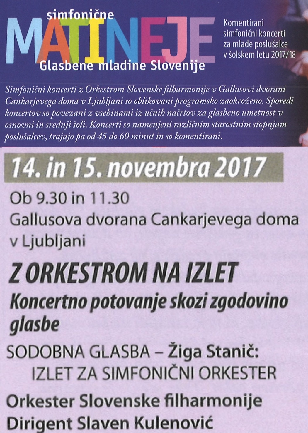Concert event for the youth, performed by Slovene Philharmonic orchestra. Žiga Stanič, moderator.